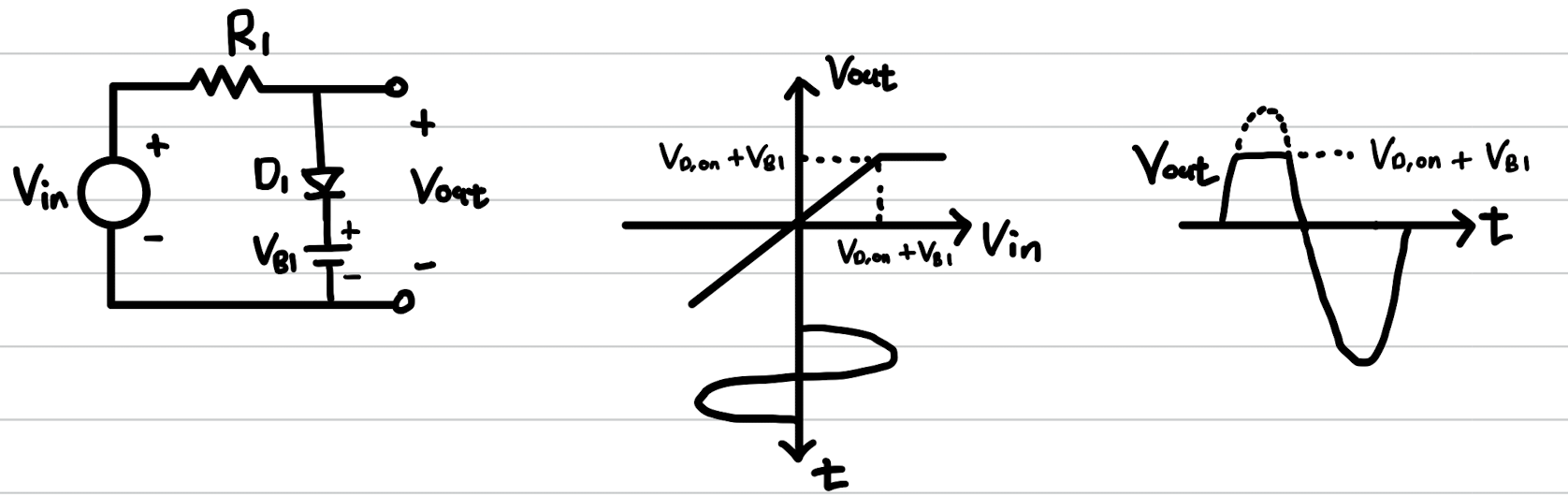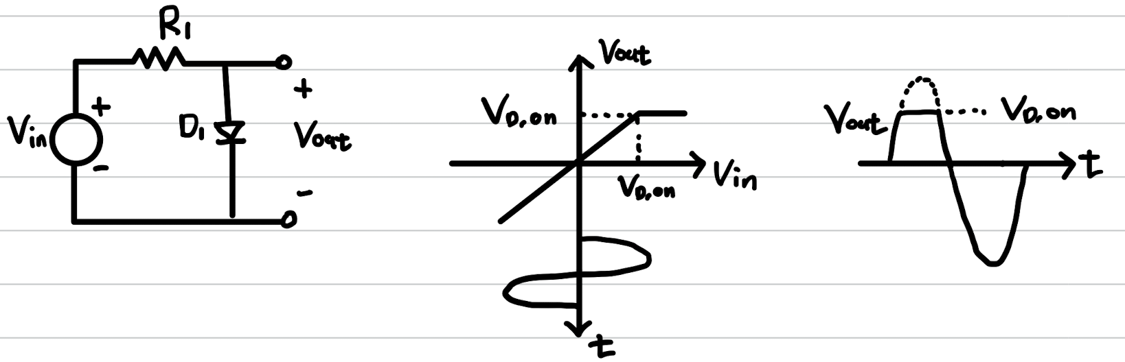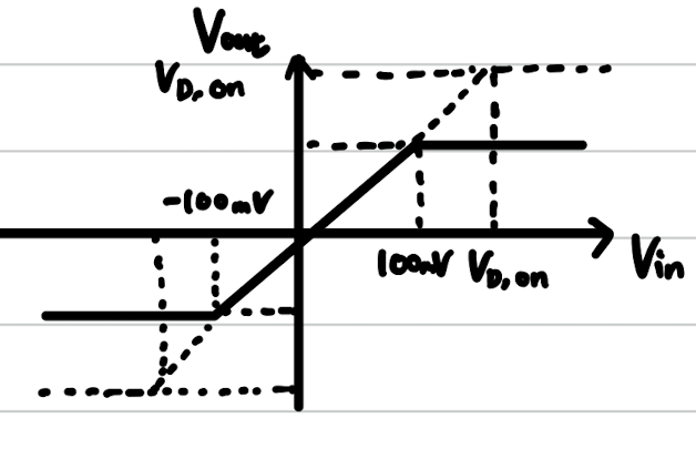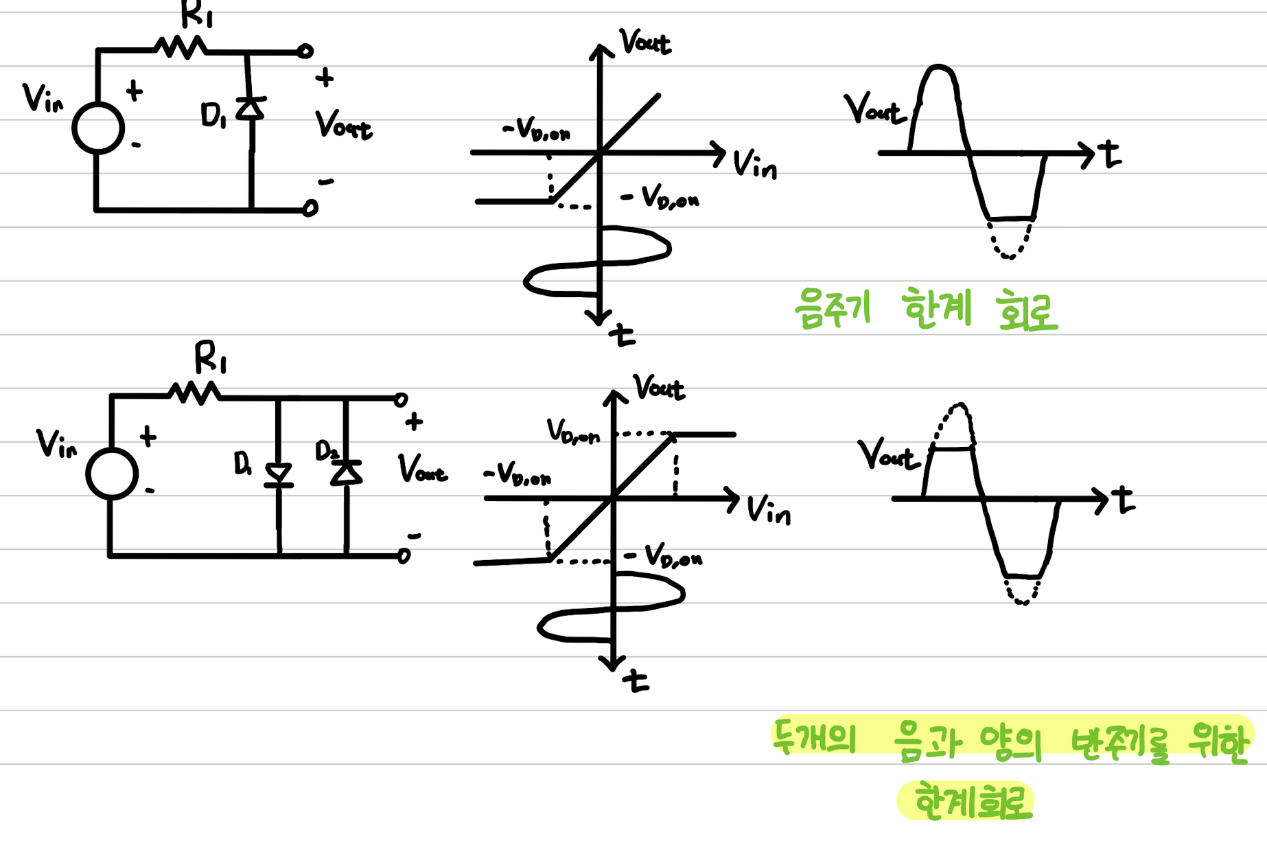 위와 같이 V(in) < V(D,on)에 대하여 V(out)은 V(in)과 같으면 그후에는 V(D,on)과 같다.