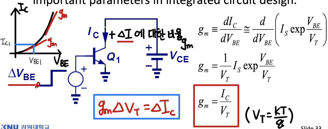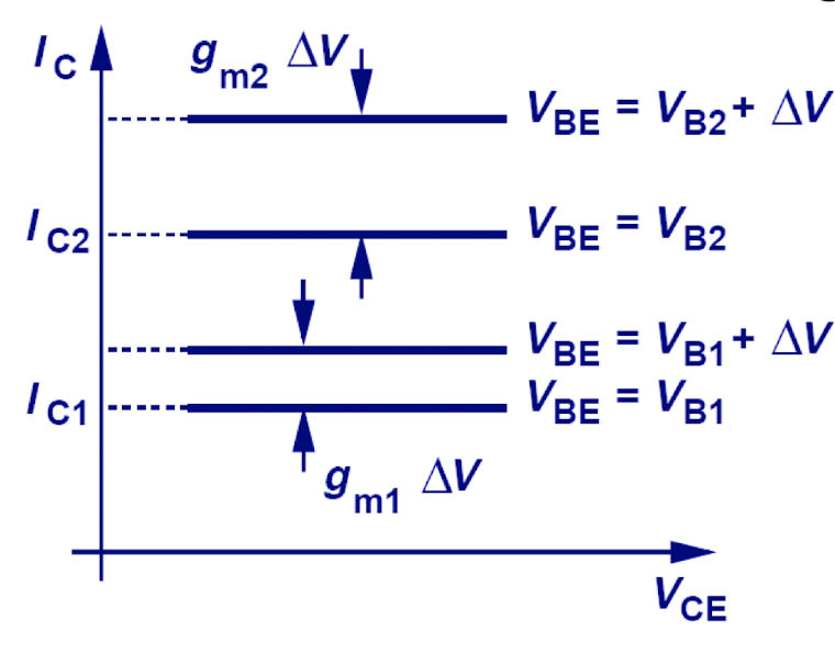 g(m) 은 V(BE)의 변화에 대한 I(C)의 변화를 나타날 때에도 사용되며 좌측 그래프를 보면 gm은 기울기로 볼 수 있으며, V(BE)가 커질수록 g(m)또한 커지는 것을 알 수있다.