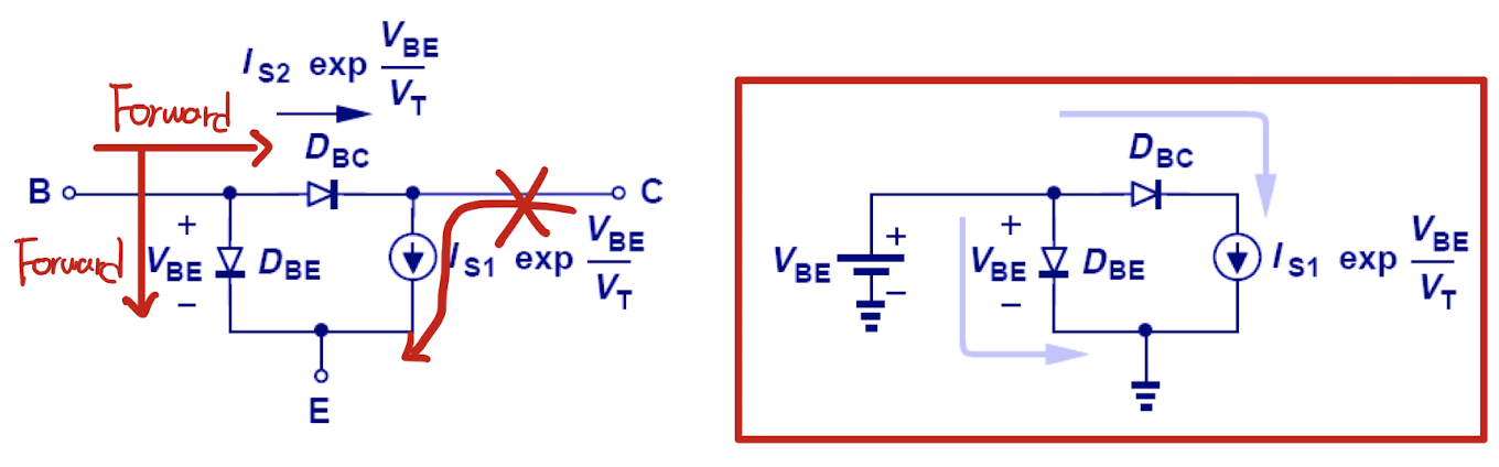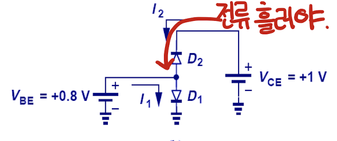 밑은 잘못된 BJT 모델링 입니다. 위쪽에서 아래쪽으로 전류가 흘러야하는데 D2 다이오드가 저렇게 있으면 전류를 흘려 보낼 수 없습니다.