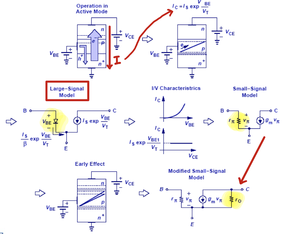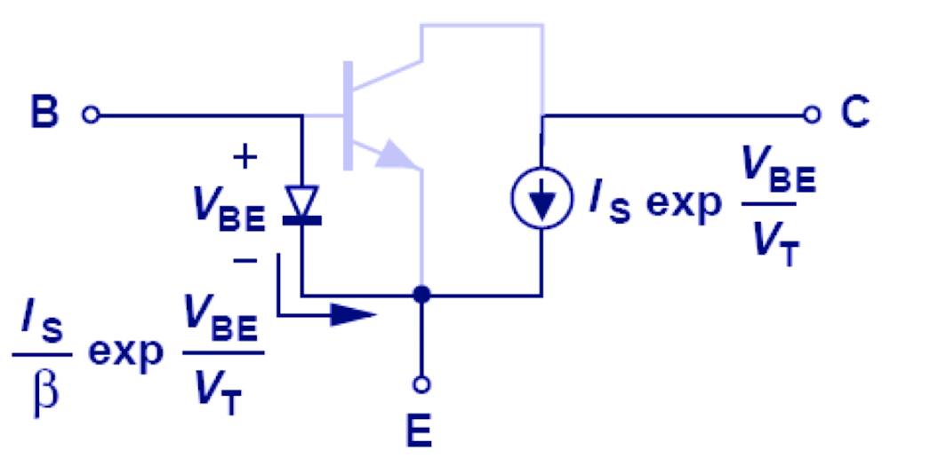 BJT의 대신호 모델은 base와 emitter 사이에 다이오드가 놓여있는 형태로 볼 수 있고 다이오드에 걸리는 전압 V(BE)에 의해 종속되는 전류원 또한 존재합니다. current gain또한 똑같습니다.