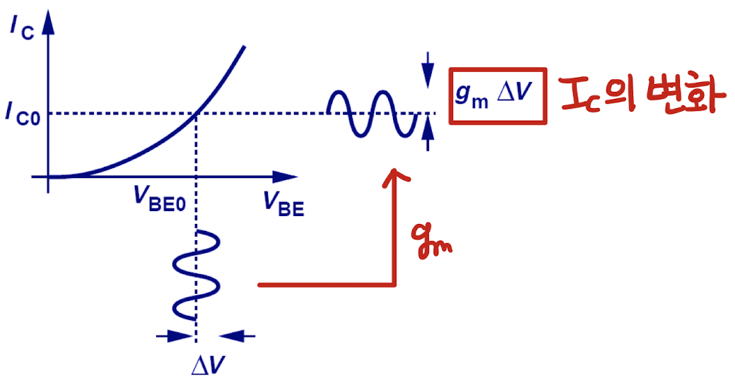 g(m) 은 V(BE)의 변화에 대한 I(C)의 변화를 나타날 때에도 사용되며 좌측 그래프를 보면 gm은 기울기로 볼 수 있으며, V(BE)가 커질수록 g(m)또한 커지는 것을 알 수있다.