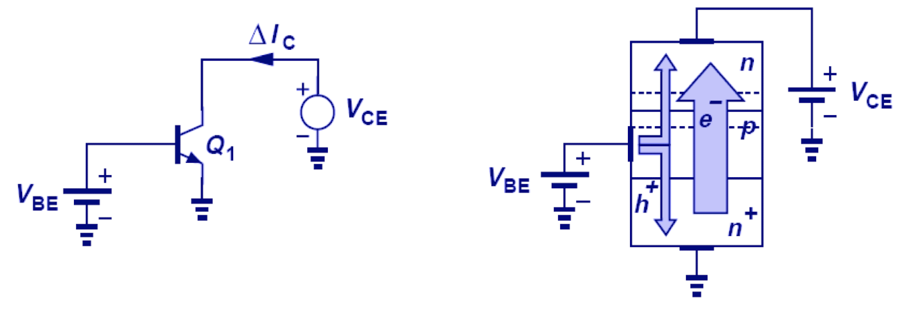 > 컬렉터 전압이 베이스 전압보다 낮아 졌을 때, CB 결합은 순방향 바이어스 걸린다. 즉, 베이스 전류가 증가하고 그로 인해 current gain B가 감소한다.