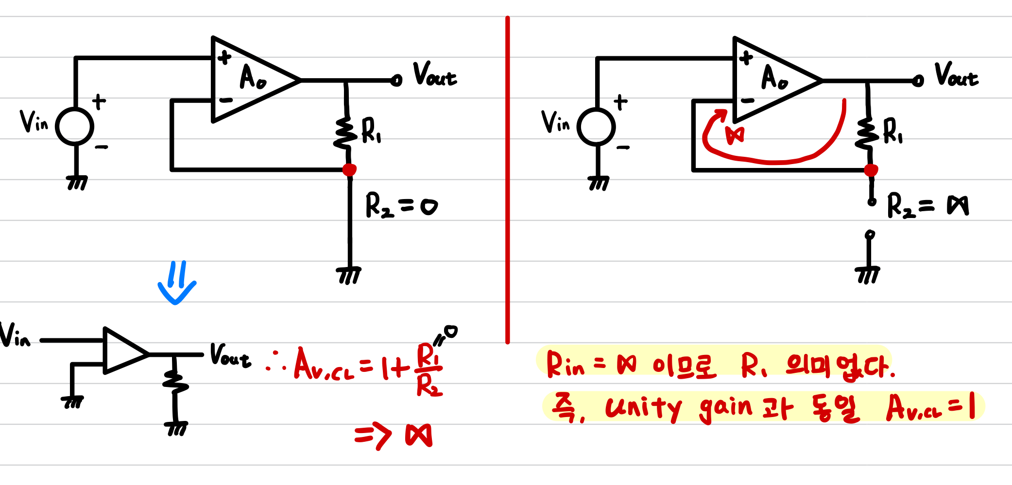 negative input이 ground되면 gain이 양수이다. >> noninverting