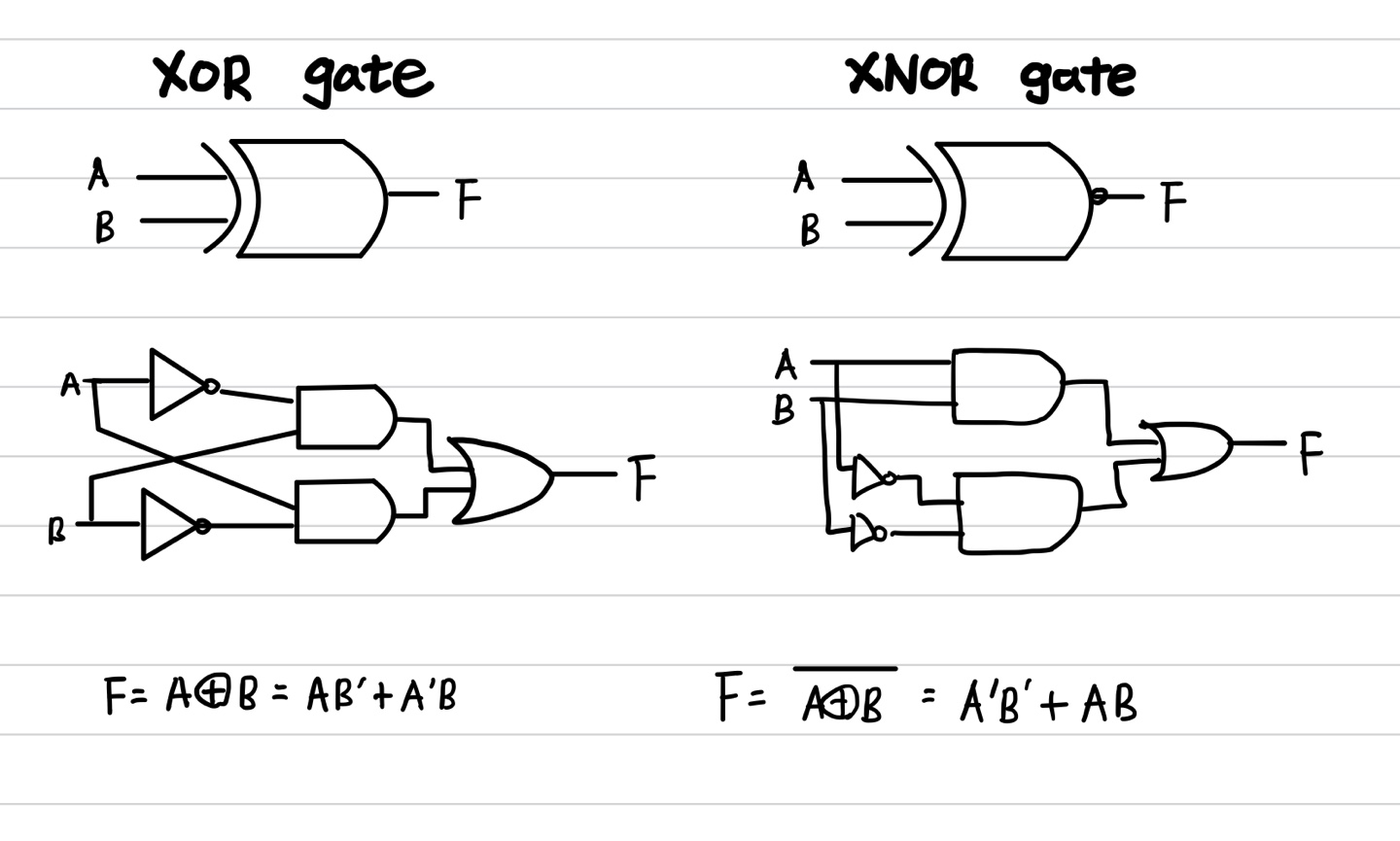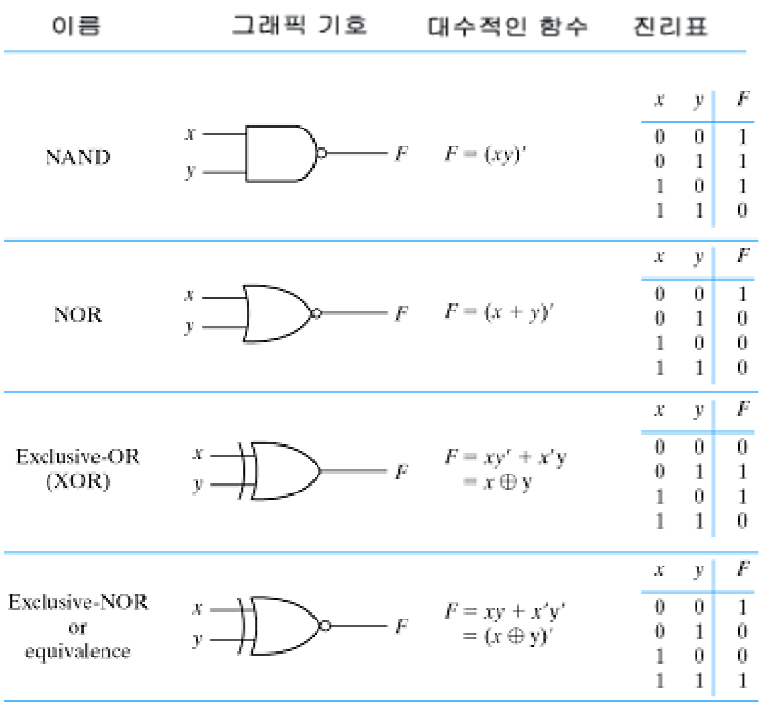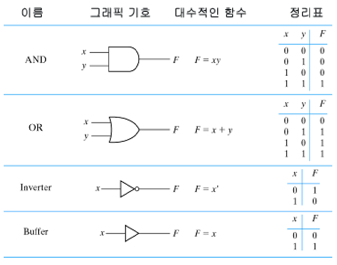 컴퓨터 시스템을 비롯한 모든 디지털 시스템은 여러가지 논리 게이트가 모여 조합논리회로와 순서논리회로로 구성되며 각 게이트는 서로 다른 모양으로 표현한다. 기본이 되는 논리 게이트는 AND,OR,NOT 게이트가 있으며 이들의 조합으로 만든 게이트에는 NAND,NOR,XOR,XNOR 게이트 등이 있다.