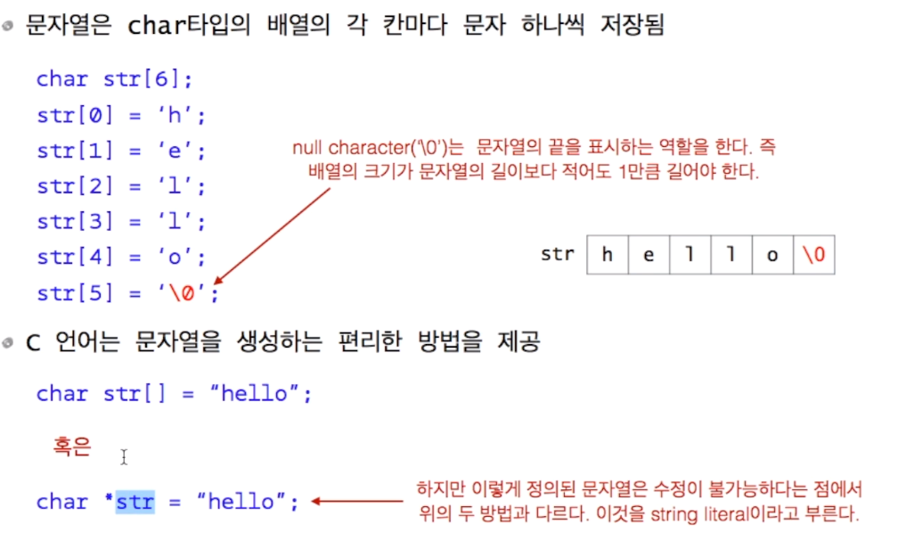 문자열은 char타입의 배열의 각 칸마다 문자 하나씩 저장되는 형식입니다.