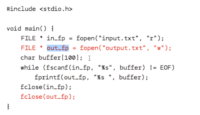 파일을 열대 fopen, 'r'은 읽기 , 파일을 오픈하면 파일 포인터를 리턴, 파일로 부터 문자열을 하나씩읽어 출력