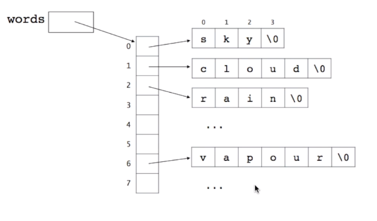 char* words[100]; // 각각의 칸에 단어의 배열을 집어넣는다. > 각 주소에 집어넣는다. > 포인터