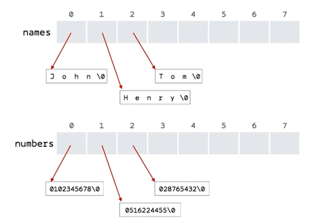 위와 같이 names와 numbers배열은 각각의 칸에 이름과 전화번호가 남긴 배열이 들어가야 한다. 즉, names numbers의 배열의 타입이 일반적인 char형이 아니라 cahr* 형이 되어야한다.