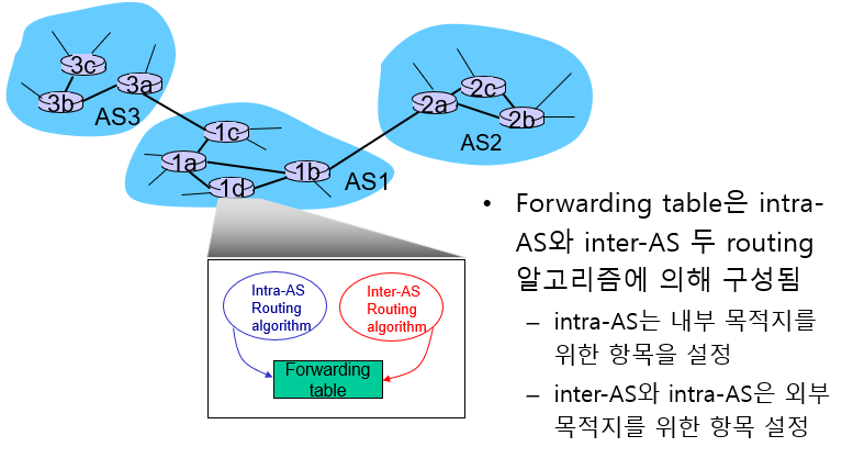 - Forwarding table은 intra-AS와 inter-AS 두 routing 알고리즘에 의해 구성된다.