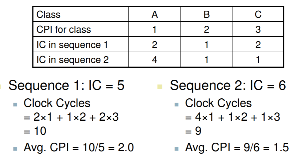 컴퓨터 성능에 대한 완벽하고 믿을 만한 척도는 실행시간밖에 없음을 잊지 말자. 예로 명령어 개수를 줄이기 위해 명령어 집합을 바꾸었을 때 클럭 속도가 느려지거나 CPI가 커져서 오히려 성능이 더 나빠질 수도 있다. 마찬가지로 CPI는 실행되는 명령어 종류에 따라 달라지므로 실행 명령어 수가 적은 코드가 항상 가장 빠른 것은 아니다.