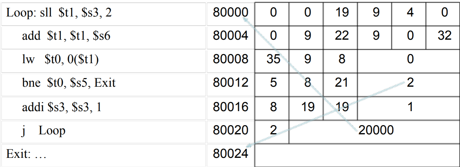 MIPS명령어는 바이트 주소를 사용하므로 이웃한 워드의 주소는 4씩 차이가 남습니다. 네 번째 줄의 bne명령은 다음 명령어 주소 80016에 8을 더해서 목적지 주소를 구합니다. 현재 명령어 기준의 상대적 위치(12 + 800012)나 목적지 주소 전체80024가 아니라 다음 명령어를 기준으로 한 상대적 위치(8+80016)로 분기 주소를 나타내기 때문입니다. 마지막 줄의 점프 명령어는 Loop에 해당하는 주소 전체(20000*4=80000)을 사용합니다.