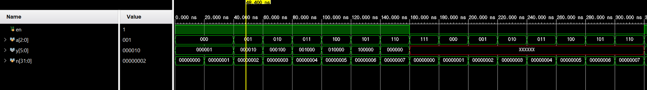 ★ Active-high enable 신호를 갖는 3 : 6 디코더를 다음의 방법으로 모델링하고, 시뮬레이션을 통해 검증한다. enable신호가 0이면 입력에 무관하게 디코더 출력은 0이된다.