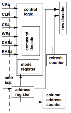 SDRAM(Synchronous DRAM), D-RDDRAM(Direct Rambus DRAM), DDR SDRAM(Dual Data Rate Synchronous DRAM)과 같은 최근의 DRAM디바이스들은 FDM DRAM보다 더 복잡한 컨트롤 로직을 포함합니다. 다음 그림은 SDRAM 디바이스의 컨트롤 로직을 나타낸 것입니다.