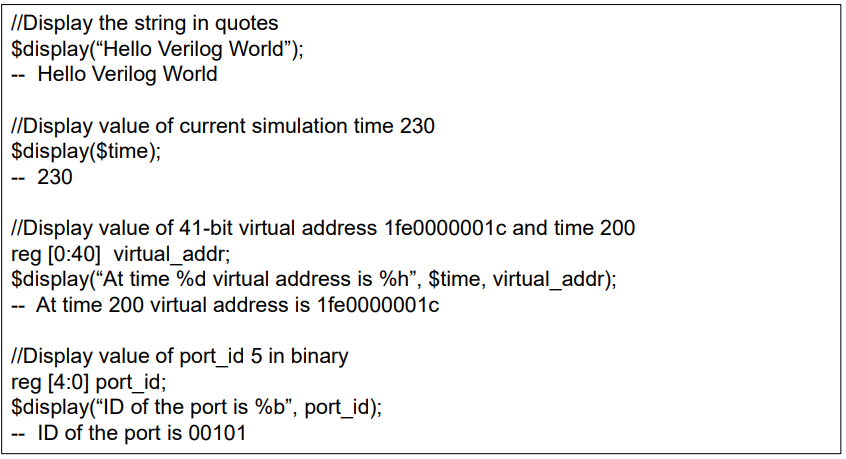 $display는 변수의 값 또는 문자열 또는 수식을 출력하기 위한 주요 시스템 태스크이다. C의 printf와 유사하다.