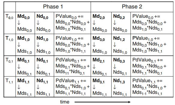 그림 5의 왼쪽 그림을 보면 Md, Nd가 2*2크기의 tile로 쪼개짐을 알 수 있다. 이제 각 thread는 내적을 사용할때 단계별로 실행한다. 매 단계마다 한 block의 모든 thread들은 Md tile한개와 Nd tile한개를 shared memory에 적재한다. 한 Blcok에 속한 각 thread가 하나의 Nd원소와 하나의 Md원소를 shared memory에서 읽어온 후, 이 요소들은 내적을 계산하기위해 사용된다.