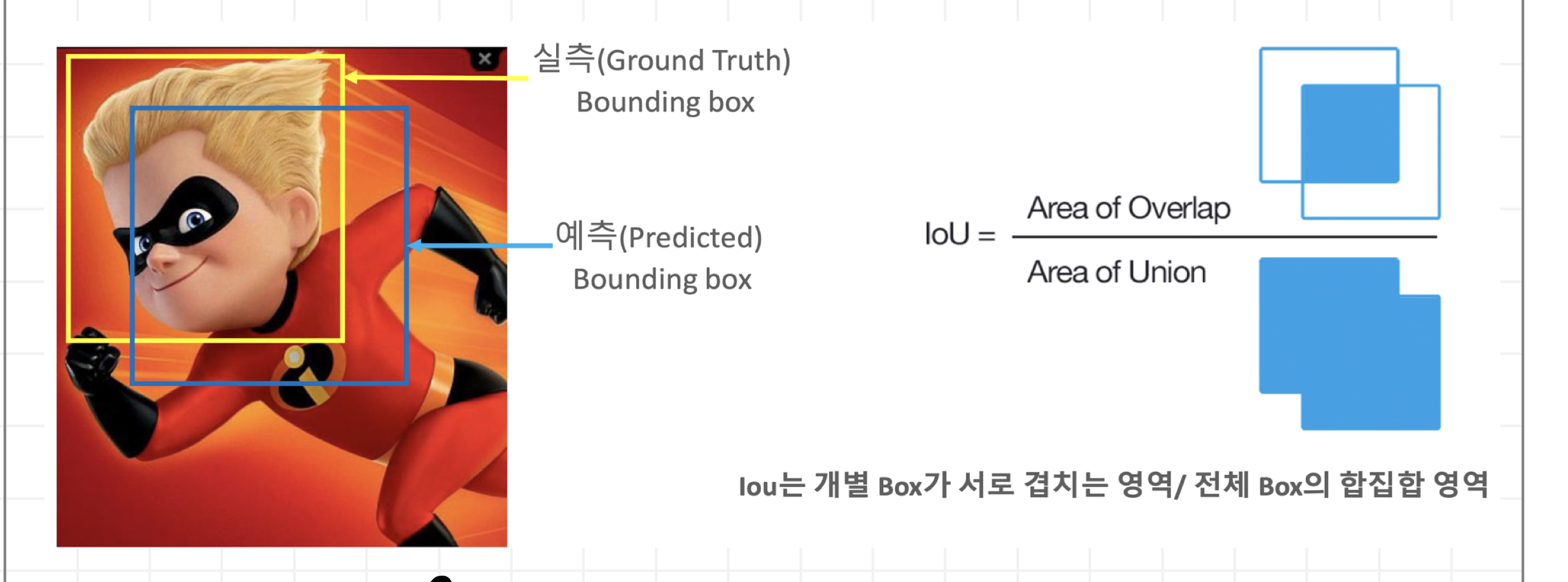 모델이 예측한 결과와 실측(Ground Truth)Box가 얼마나 정확하게 겹치는가