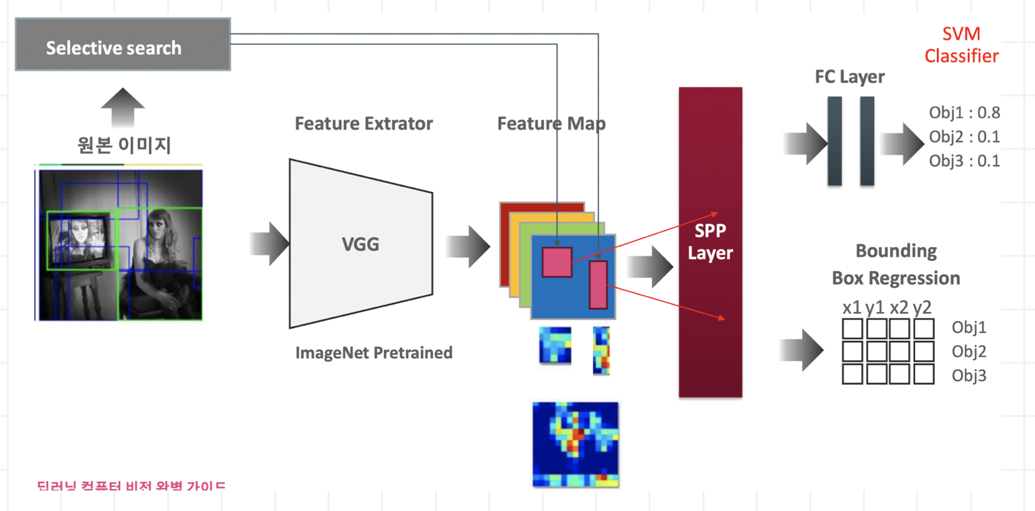 2000개의 Region Proposal 이미지를 CNN을 Feature Extraction 하지말고 원본이미지만 Feature Map 생성뒤에 원본이미지의 Selective Search로 추진된 영역의 이미지만 Feature Map으로 매핑하여 별도 추출