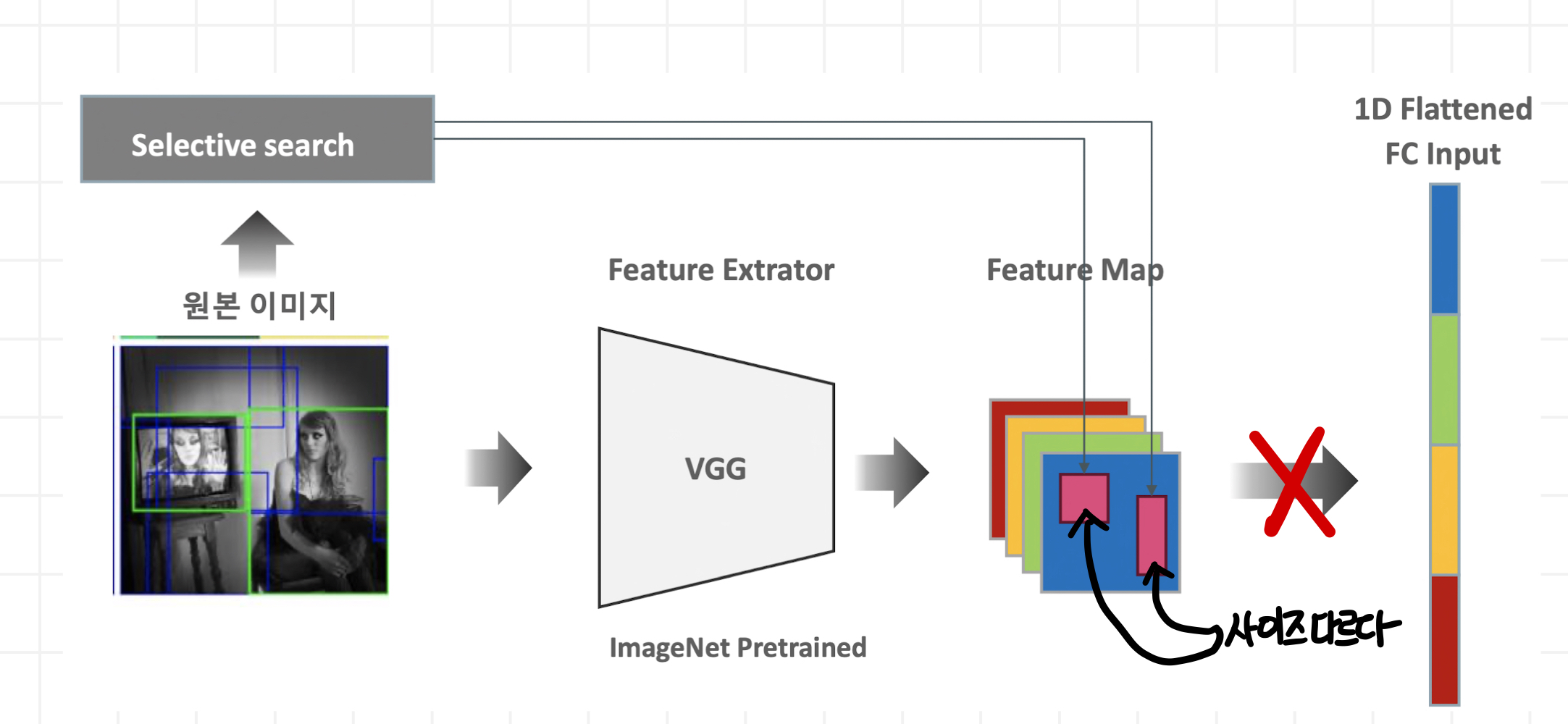 > 서로다른 사이즈의 Region Proposal 이미지를 SPP Net의 고정된 크기 vector로 변환하여 FC에 1D Flattened된 input 제공