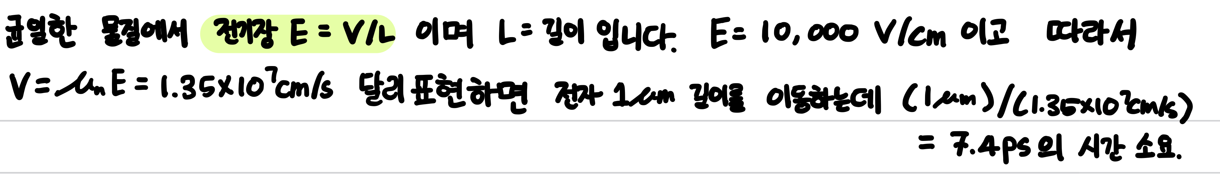 Ex) 길이 1um인 n형 실리콘 조각에 1V 전압이 가해질때 전자의 속도는 ?