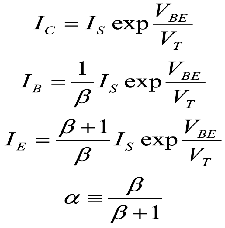 이상적으로, 그림과 같이 BJT 트랜지스터는 1번,2번의 터미널의 전위차 즉, V1에 비례하여 전류가 3번에서 2번으로 I(s)*exp(V1/V(T)) 만큼 흐른다.