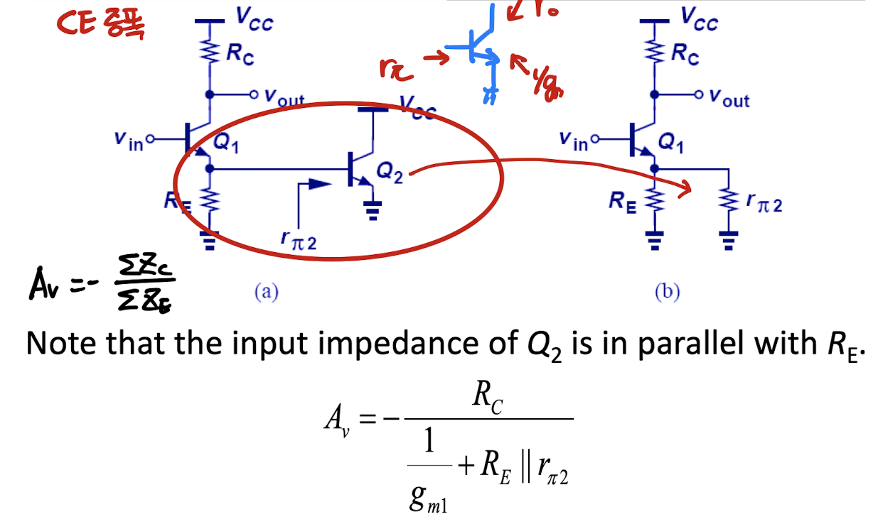 위의 그림과 같이 gain을 쉽게 구하는 방법은 -[컬렉터에서 본 총 임피던스 / 에미터에서 본 총 임피던스]
