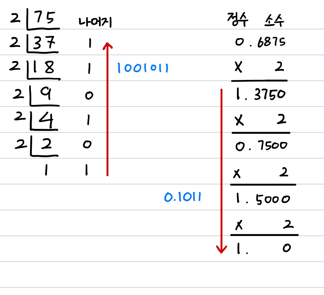 10진수 정수 부분을 2진수로 변환할 때는 2를 나누고 그 나머지를 나열하면 2진수가 된다.